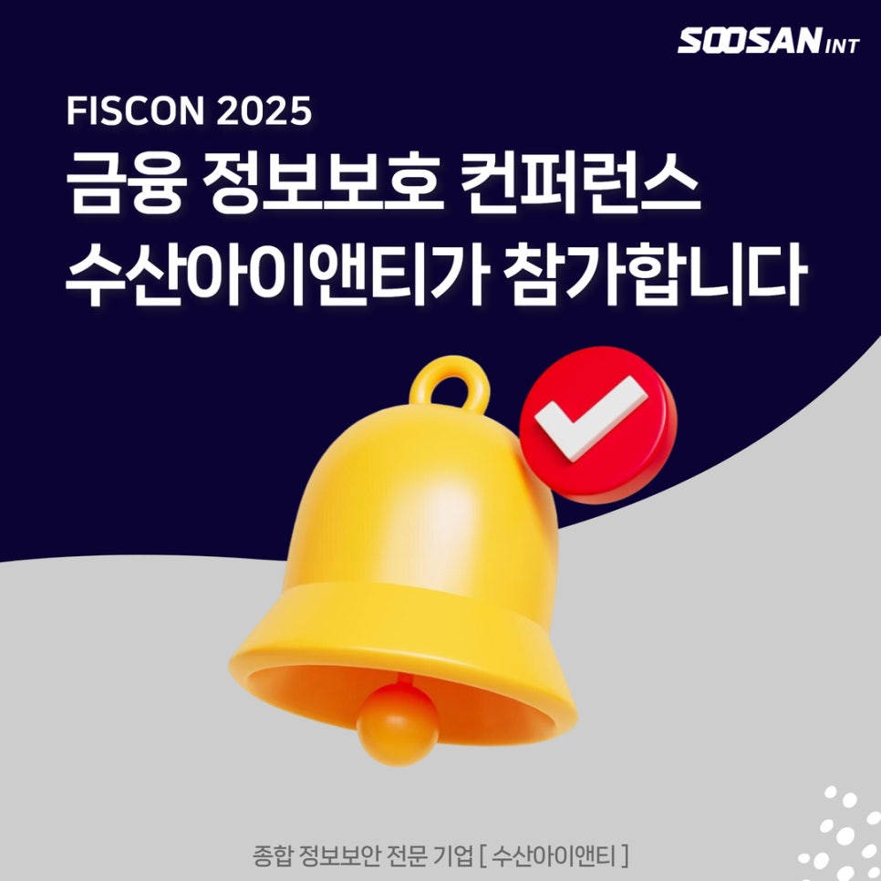 국내 최대 금융보안 컨퍼런스 'FISCON 2025'가 11/20일(목), 여의도 콘래드 서울에서 개최됩니다. 본 행사에서는 금융권을 포함한 각 분야의 CISO 및 사이버보안 실무자, 주요 보안 기업들이 참석하여 금융보안의 현안과 미래 전략을 심도있게 논의할 예정입니다. 행사 당일 수산아이앤티 전시 부스를 방문하시어, 국내 1위 보안 솔루션 및 보안 컨설팅 서비스를 만나보시고, 다양한 이벤트도 참여하세요🎁