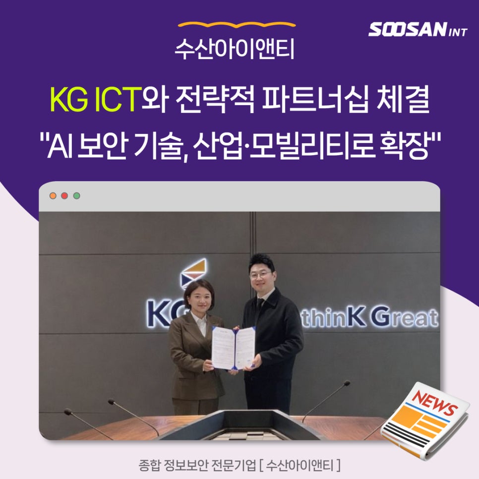 수산아이앤티가 KG ICT와 전략적 파트너십을 체결하고, AI 기반 보안 기술을 제조·모빌리티·전장 산업 전반으로 확대합니다. 이번 협력은 양사 간 보안 정책 및 중·장기 로드맵 공동 수립, AI 보안 기술 기반 협업을 통해 공장 자동화·전장 환경 등에 최적화된 보안 체계를 구축하는 것이 핵심인데요. 양사는 산업 현장의 보안 사각지대에 대한 선제적 위협 대응을 강화하며, 보안이 내재화된 산업 혁신을 가속화해 나갈 예정입니다.